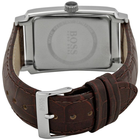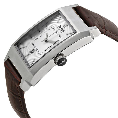 A classic design from Hugo Boss. This men’s watch features from a rectangular stainless steel case and attractive brown leather strap. The attractive silver dial is home to luminous silver-tone hands and silver hour markers and a date indicator. It has also been fitted with a scratch resistant mineral crystal lens, has a water resistance rating of 3 ATM and is powered with a reliable quartz movement.